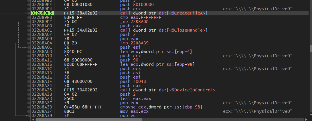 The malware uses DeviceIoControl to retrieve parameters of the disk: