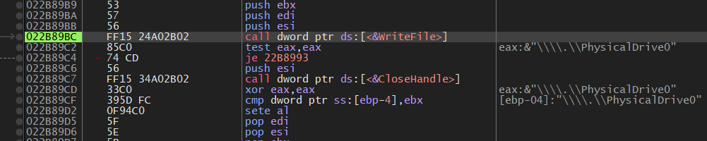 The malware writes the MBR payload into the physical drive via WriteFile.