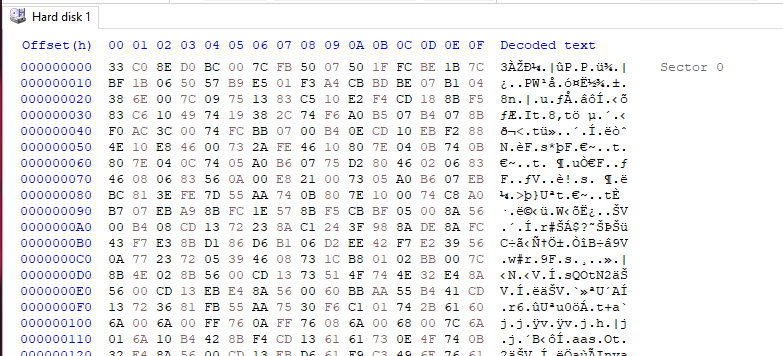 Then, the MBR payload can be retrieved in x32dbg. On the other hand, it can also be retrieved using HxD. HxD allows users to directly edit the hard disk: