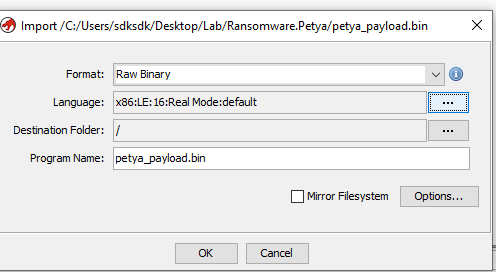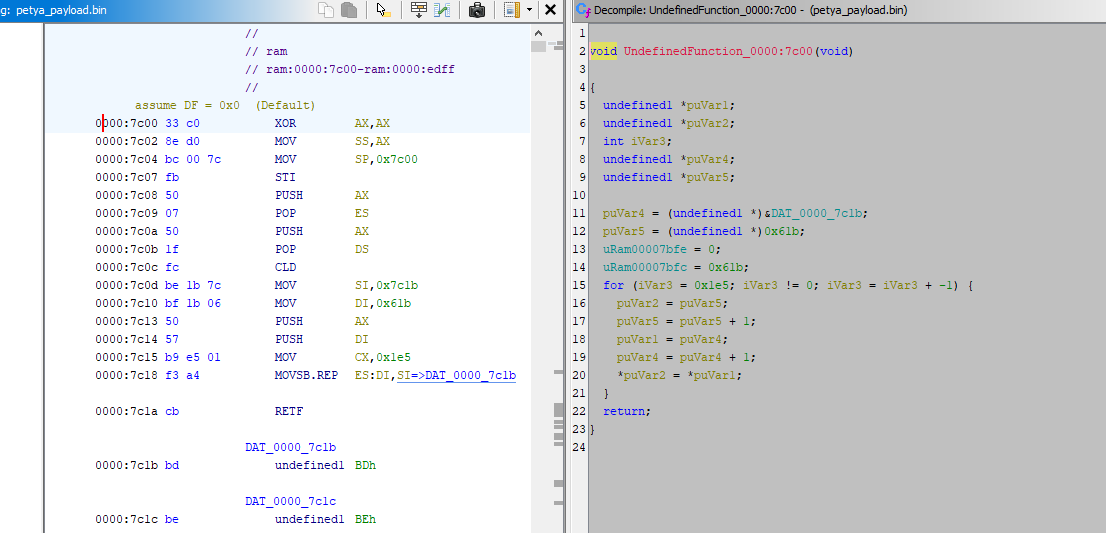 If you attempt to disassemble Petya’s MBR code using a 32-bit setting, the Opcodes will be misinterpreted. Certain byte sequences that represent a single 16-bit instruction might be seen as part of a 32-bit instruction, leading to incorrect instructions or registers being represented (e.g., using EAX instead of AX).