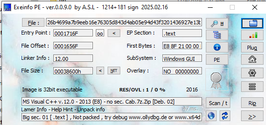 Open the malware using ExeInfo PE and DIE (Detect It Easy):