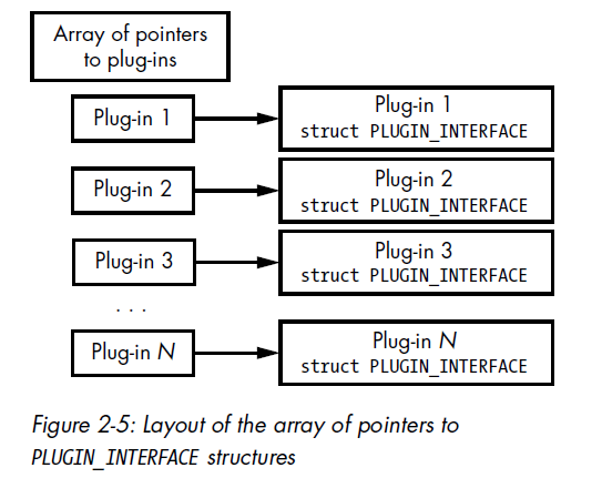 Plug-ins downloaded from the C7C server and loaded and executed by the malware. Festi maintains an array of pointers to a specially defined PLUGIN_INTERFACE structure.
